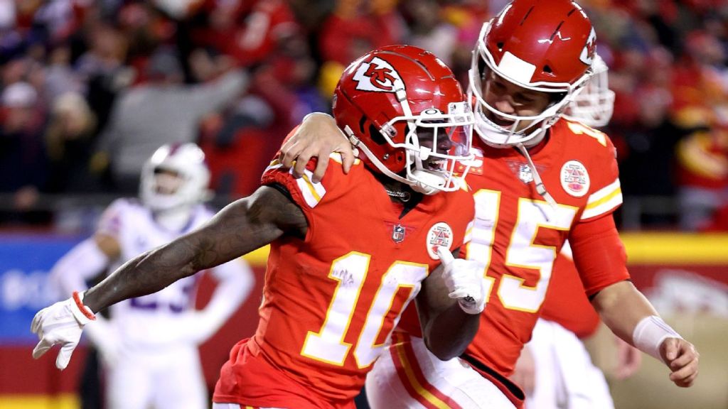 2020-21: 145 targets (Kelce), 105 receptions (Kelce), 1,416 yards (Kelce), 14.7 YPR (Hill), 15 TD (Hill)